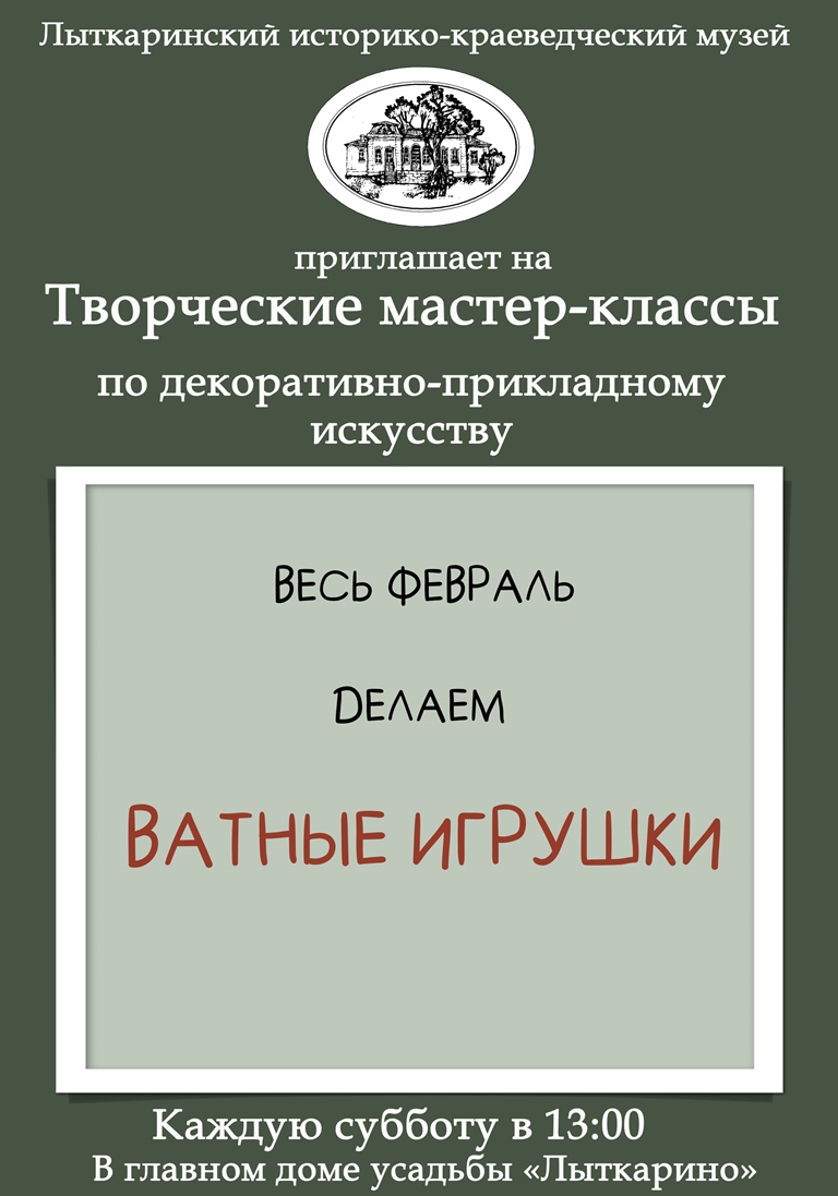 Лыткаринский историко-краеведческий музей каждую субботу в 13:00 часов приглашает всех желающих на творческие мастер-классы по декоративно-прикладному искусству. Тема февраля – изготовление ватной игрушки по старинной технологии.