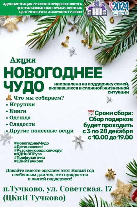 Центр культуры и искусств Тучково приглашает всех желающих принять участие в акции «Новогоднее чудо», которая направлена на помощь семьям, оказавшимся в трудной жизненной ситуации. Эта инициатива создана для того, чтобы создать атмосферу праздника и радости для тех, кто в этом особенно нуждается.