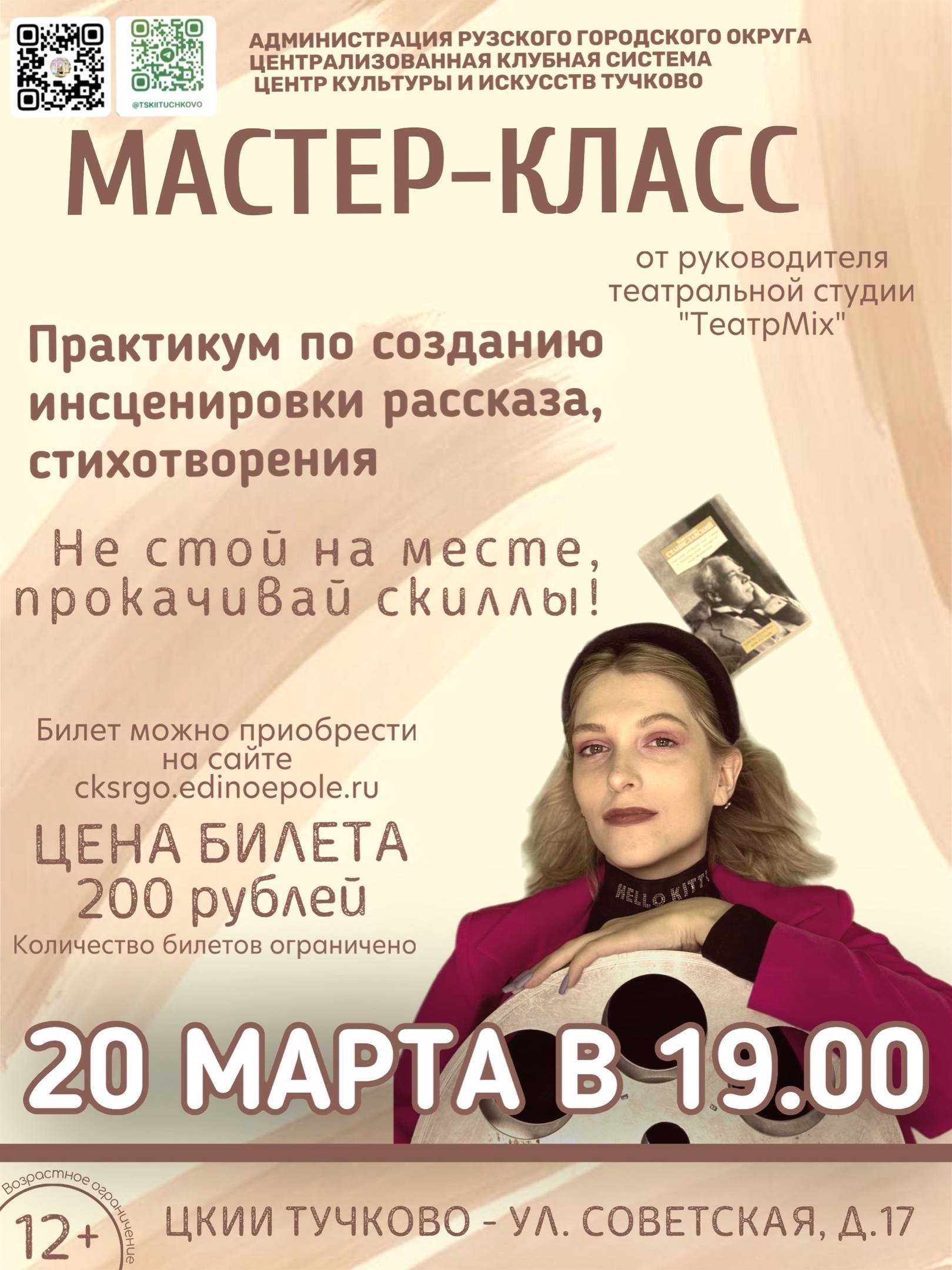 20 марта в Тучковском центре культуры и искусств Рузского городского округа состоится мастер-класс от руководителя театральной студии "ТеатрMix" Елены Чугуновой.