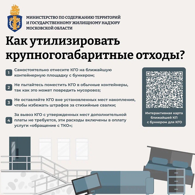 Узнать адрес расположения ближайшего бункера для отходов можно на официальном сайте ( https://mstg.mosreg.ru/deyatelnost/obrashenie-s-tvyordymi-kommunalnymi-otkhodami/utilizaciya-krupnog... ) Министерства.